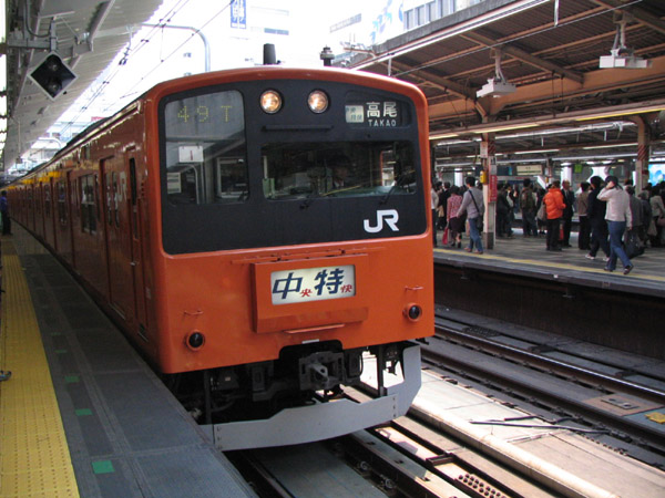 | 中央快速線は、快速がもっとも下のランク。しかし深夜早朝には各駅停車(中央総武各駅停車線経由)も走ります。 これは、たまたま新宿駅工事により、快速線が運休となったために登場した、真昼のオレンジ車体「各駅停車」。 |