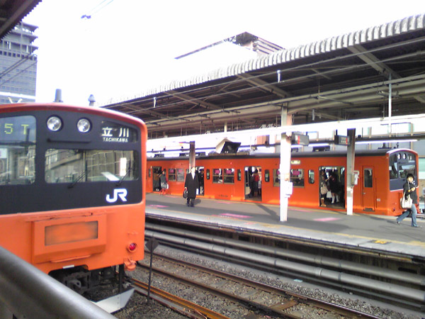 | 雪の201系。2005年冬、西立川駅で。 |