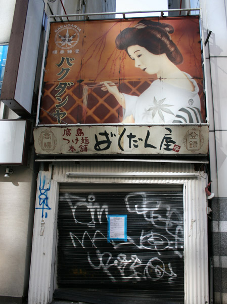 渋谷並木橋近くのお店。なんだかレトロな絵の描かれた看板が掛かってます。