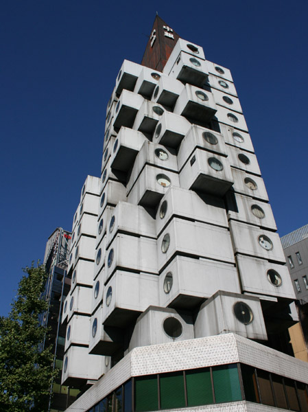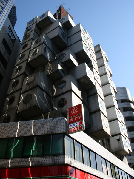 銀座8丁目に建てられたカプセル型マンション。設計は黒川紀章。1972年建設。