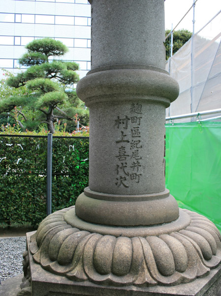 これは、豊川稲荷神社の灯籠に刻まれた奉納者の名前に見られる「麹町区紀尾井町」。