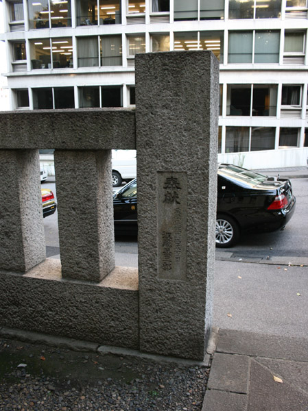これは、日枝神社の男坂の鳥居の脇の柵で、奉納者の住所として「京橋区銀座西五丁目」とあります。
