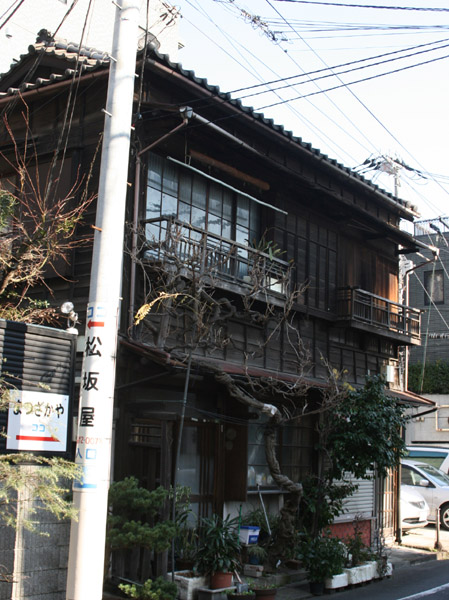 個性的な特徴はないですが、黒い下見板の典型的な昔の木造家屋です。軒下の木も似合ってます。
