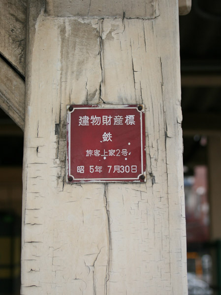 ホーム立川側の柱に張られた建物財産標。駅よりもかなり古い年月日になっている。