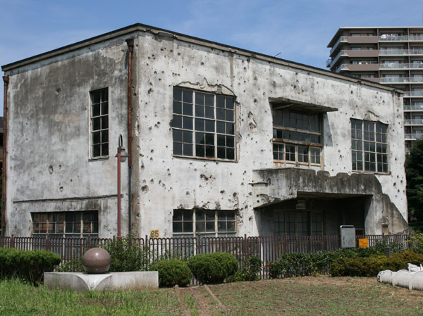 東大和市の東大和南公園内に残る戦前の日立航空機変電所。戦時中の機銃掃射の痕跡で穴だらけです。