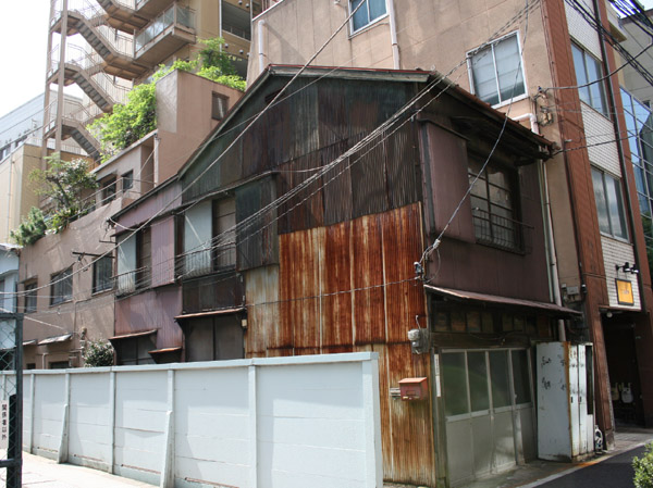 本郷で見かけたトタンの住宅。つぎはぎなのは、途中で取り付け直したのでしょうか。