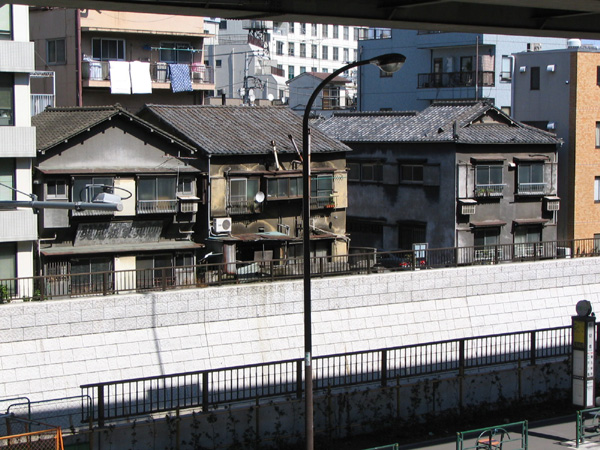 神田川沿いに建つ古い民家群。今時の家に比べてもやや大きめ?。アパートかな? 左側はお店のようだけど。