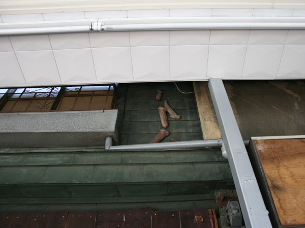 小石川の商店街にある銅板建築。アーケードによって隠れてますが、銅板が見えます。