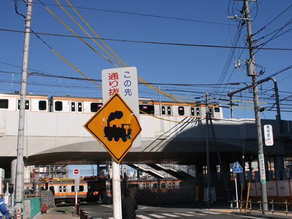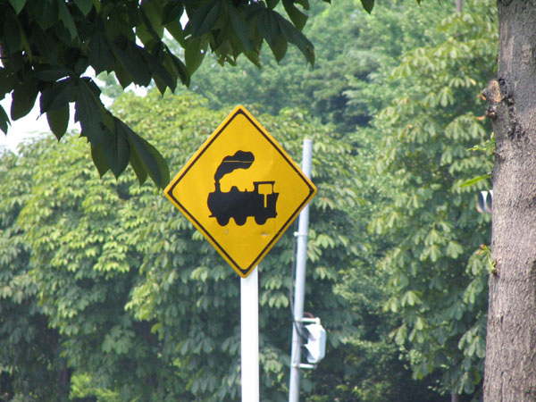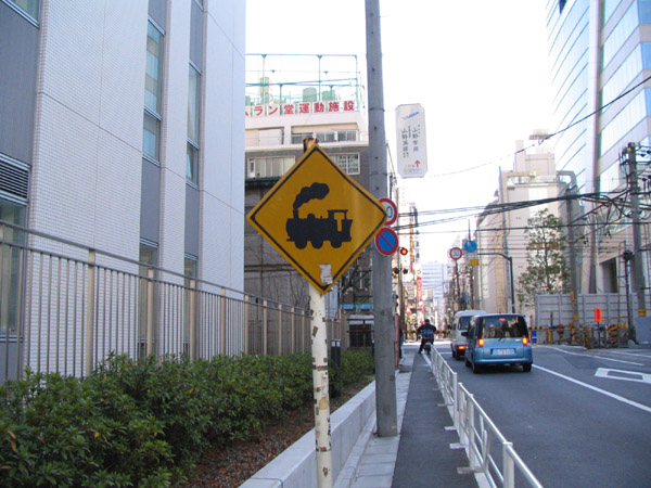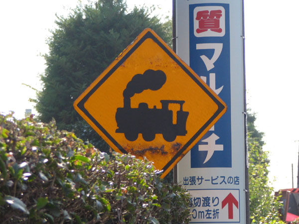 線路があることを示す交通標識。最近は電車になってますが、まだSLデザインのものも残ってます。JR青梅線立川市内。