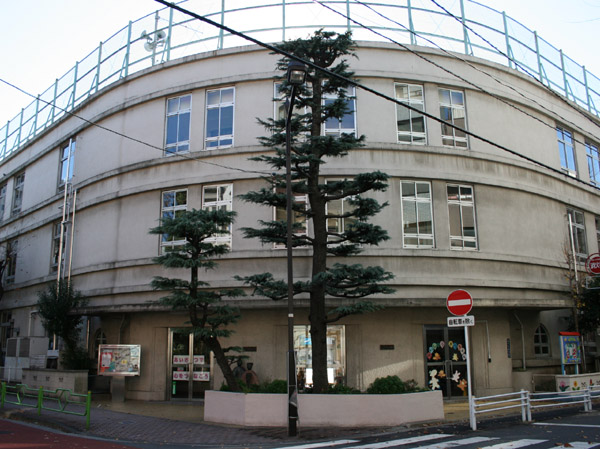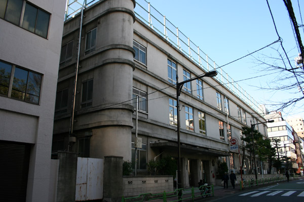 中央区新川にある小学校。昭和2年建築。曲面のデザインが復興小学校のものと共通しています。