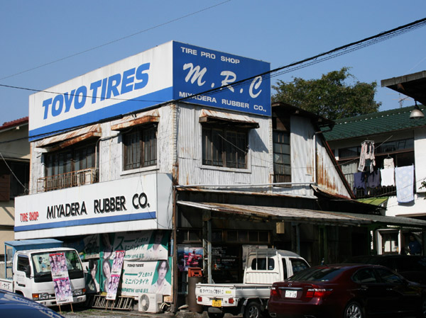 青梅市内のタイヤ店。整備工場っぽい建物、トタン風の壁、後ろに少し見える木造部分。
