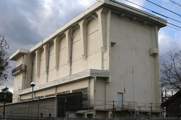 建物の裏側(施設側)。屋根を支える部分など変電所に共通するデザインです。