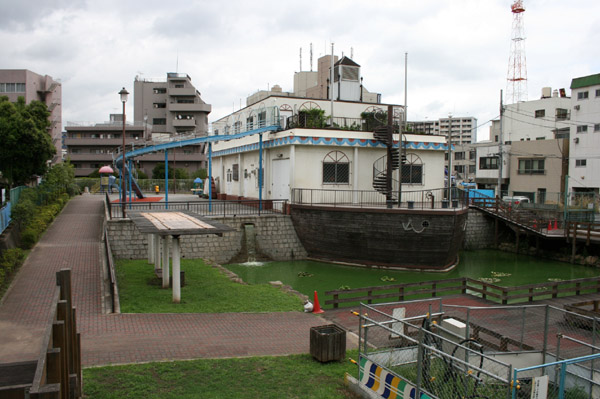 業平橋付近の大横川。埋め立てられて公園と化していますが、少々汚れた感じ。なんだか船の形をした施設も哀しい。