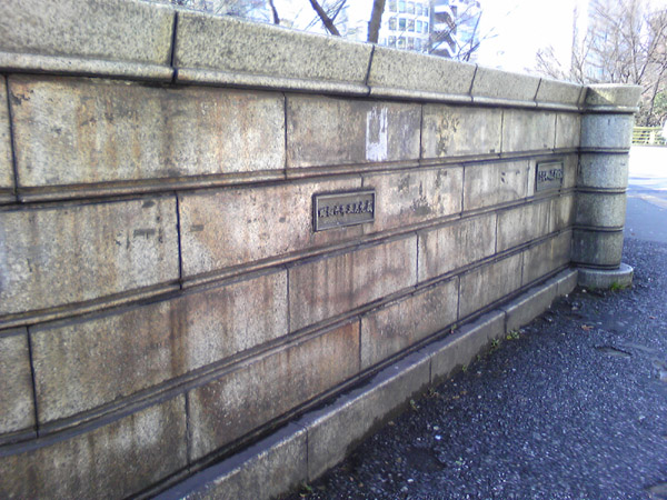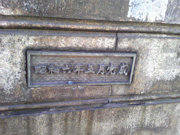 石造りの親柱の部分。【昭和六年五月完成】のプレートがはまっている。
