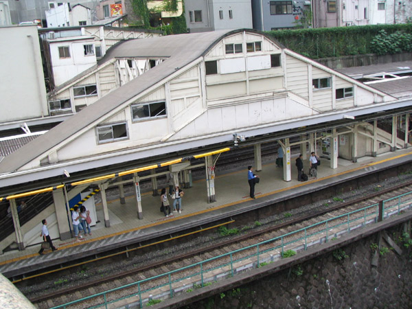 特徴的な跨線橋。すぐ下が神田川で、駅の後ろも壁になっている。