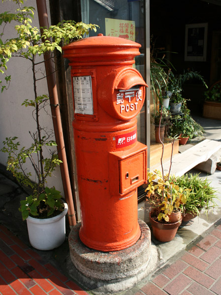 | 青梅市内で見かけた丸形ポスト。 植木に囲まれて似合ってます。 |