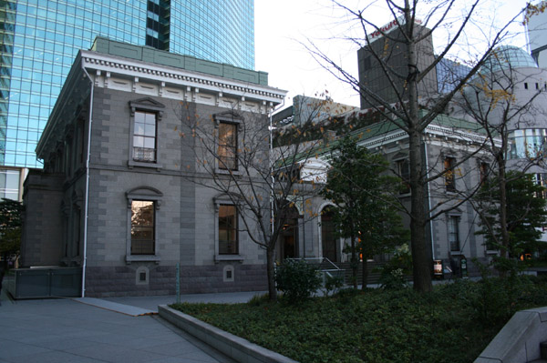 明治5年に開業した旧新橋駅の跡地に出来た初代駅舎を模した建物。この下に史跡「旧新橋停車場跡」遺構が眠っている。