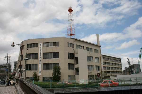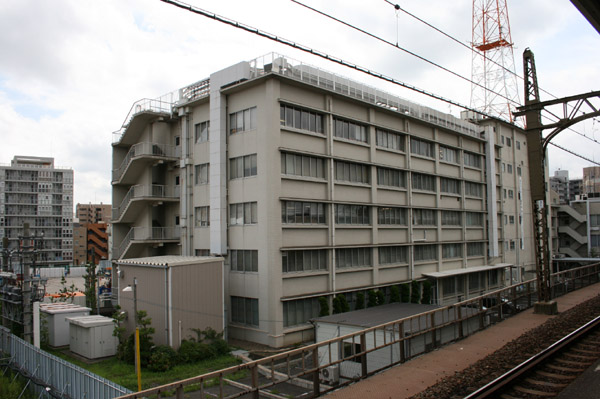 東武橋側から見た建物。東京スカイツリー建設に伴う再開発で解体予定。本社新社屋も建設中です。