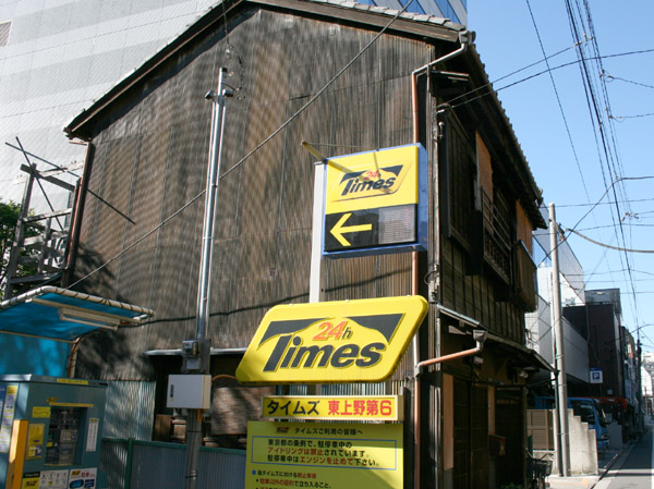 同潤会上野下アパート向かいの木造建築。手前の駐車場の看板と隔世の感がします。